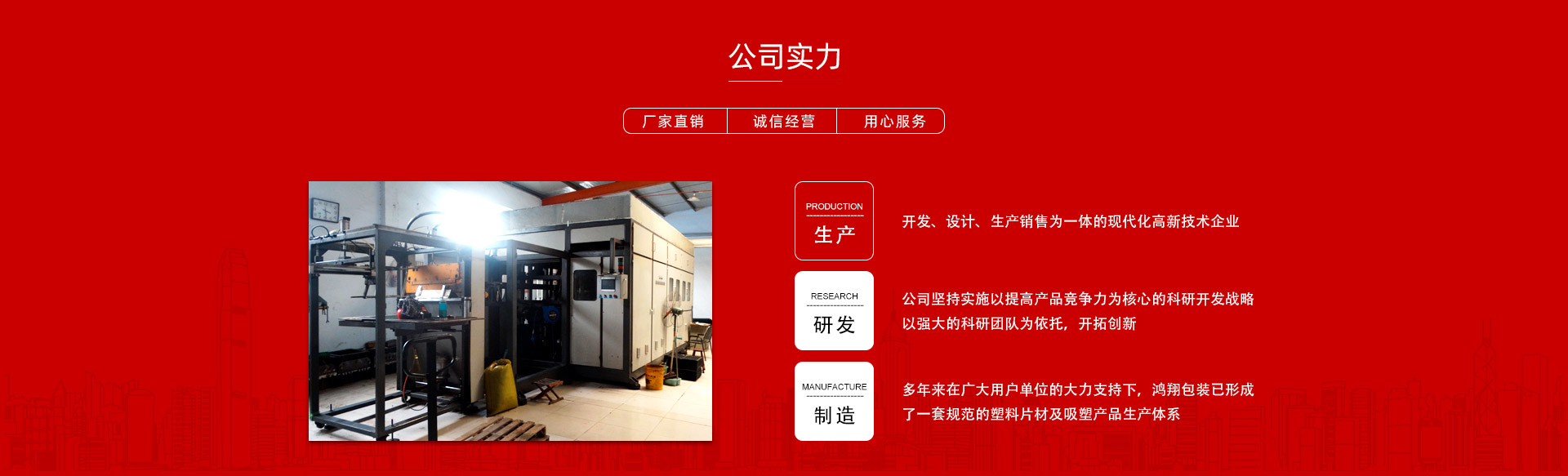 平原縣鴻翔包裝制品有限公司是一家大型生產(chǎn)塑料片材及吸塑產(chǎn)品企業(yè),本公司投資引進(jìn)電腦自動(dòng)塑料氣壓成型機(jī),壓片機(jī),全自動(dòng)高速吸塑機(jī),率先開發(fā)生產(chǎn)PVC片材,PET片材,PS片材,PP片材等,鴻翔是國(guó)內(nèi)先進(jìn)的生產(chǎn)廠家之一。本公司產(chǎn)品廣泛應(yīng)用于醫(yī)藥、食品、化妝品、日用品、農(nóng)業(yè)、五金、電子元件、工藝品等行業(yè),也可根據(jù)客戶需求自行設(shè)計(jì)制作模具。本公司技術(shù)力量雄厚,生產(chǎn)設(shè)備工藝先進(jìn)。我們秉承用戶至上的經(jīng)營(yíng)宗旨,竭誠(chéng)為您服務(wù)。